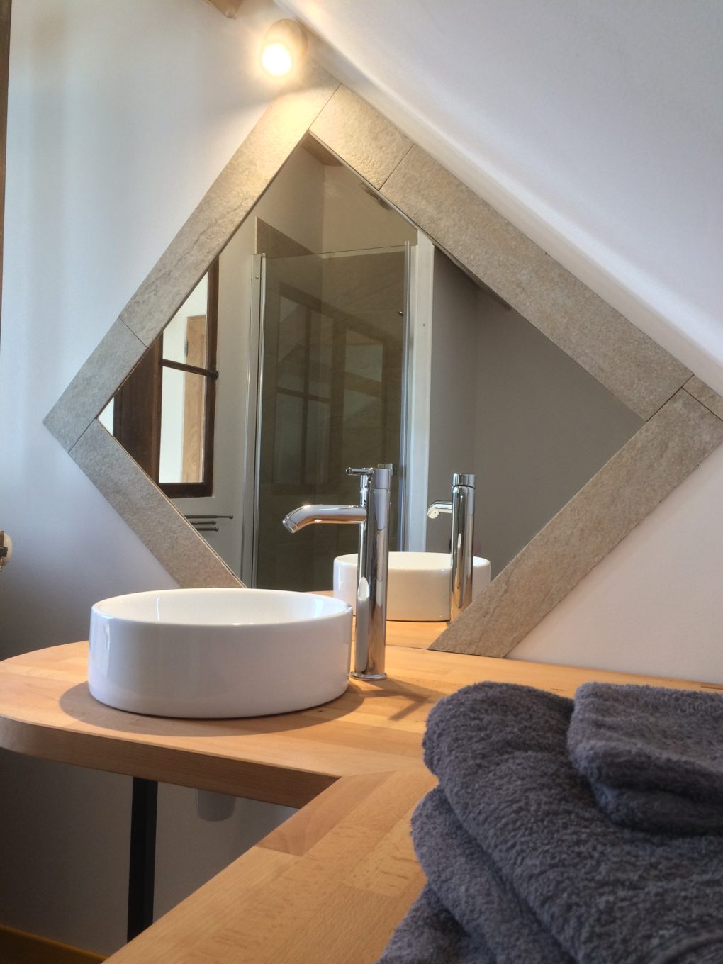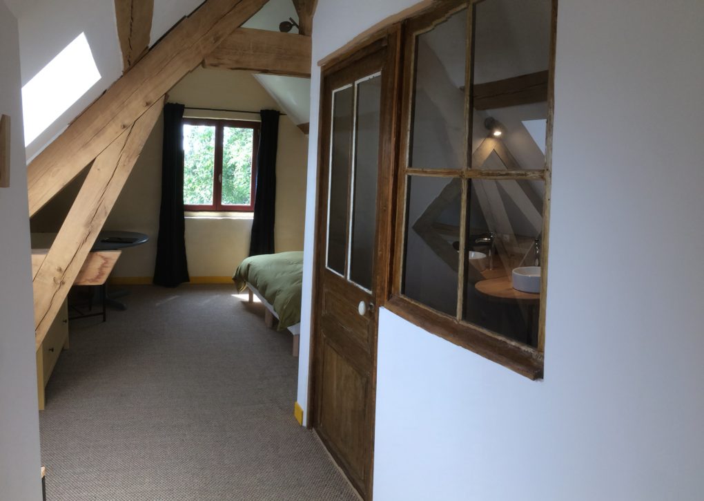 A l’étage, dans un bâtiment indépendant, nous vous proposons une chambre tout confort pour maximum 3 personnes (1 lit double 160cm, 1 lit simple 90cm), avec salle d’eau et wc privés.